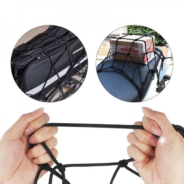 Siatka gumowa z zaczepami do przewożenia bagażu podczas jazdy motocyklem, rowerem lub skuterem. Idealne rozwiązanie do przewożenia lub przechowywania kasku, plecaka, zakupów.