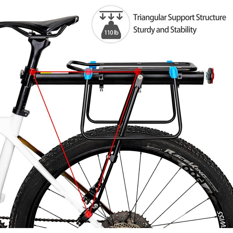 Bagażnik rowerowy ROCKBROS charakteryzuje się dużą ładownością do 50 kg. Dzięki wzmocnionej trójkątnej strukturze, bagażnik oferuje najlepszą stabilność nawet podczas jazdy po wyboistych drogach. To idealne rozwiązanie na codzienne dojazdy, wycieczki i przewożenie cięższych ładunków.