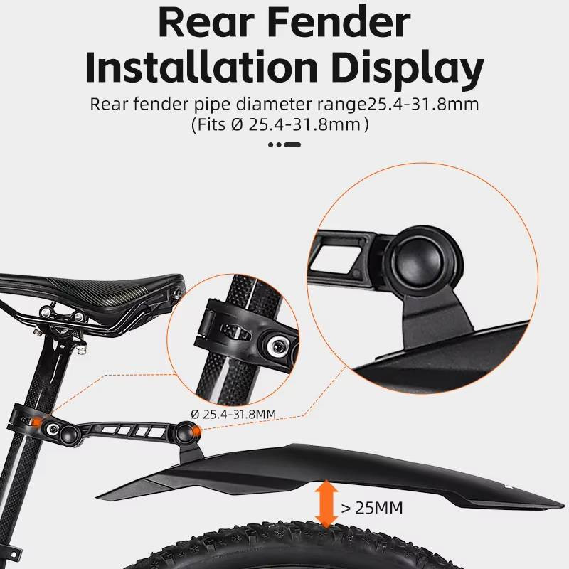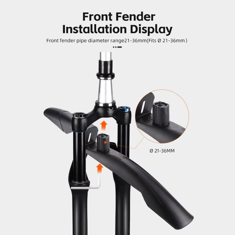 - Montaż: przedni błotnik na rurze 21–36 mm, tylny błotnik na rurze 25,4–31,8 mm