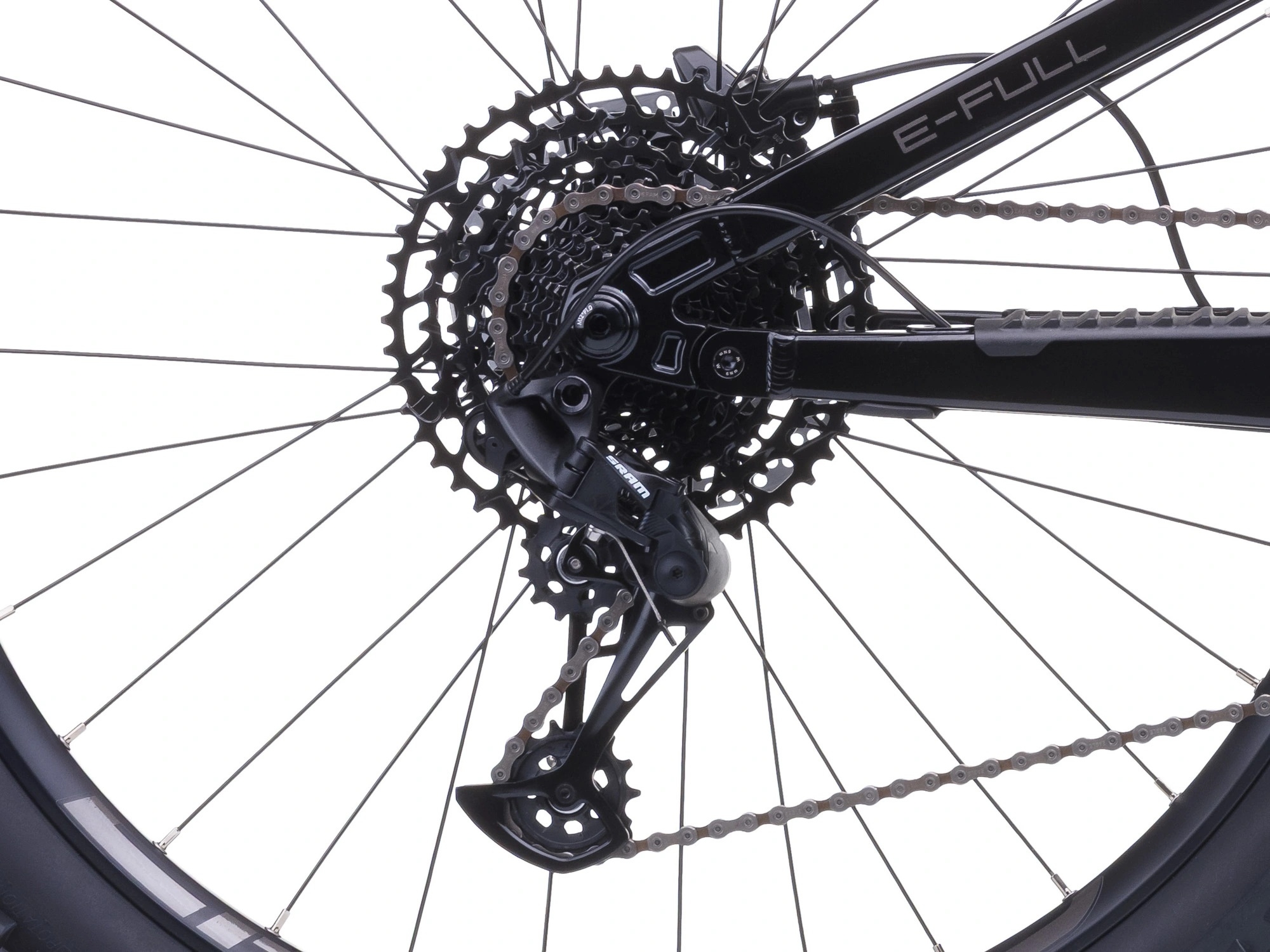 Zmianę biegów obsługuje 12-rzędowa przerzutka tylna SRAM SX Eagle, a hydrauliczne hamulce tarczowe SHIMANO Deore zapewniają niezawodną kontrolę i pewność w każdej sytuacji – niezależnie od tego, czy pedałujesz pod górę, czy zjeżdżasz w dół.