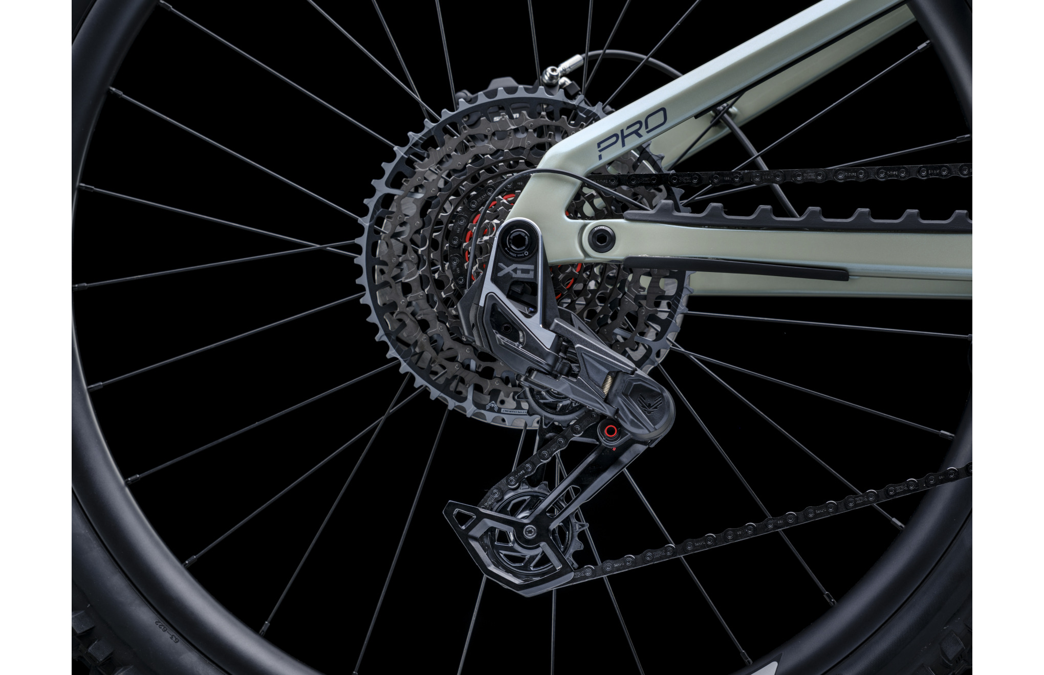 Precyzyjną i bezprzewodową zmianę przełożeń zapewnia 12-biegowa grupa osprzętu SRAM X0 Eagle AXS T-Type z wytrzymałą kasetą 10-52 i lekkim łańcuchem SRAM X0 Eagle Flattop.