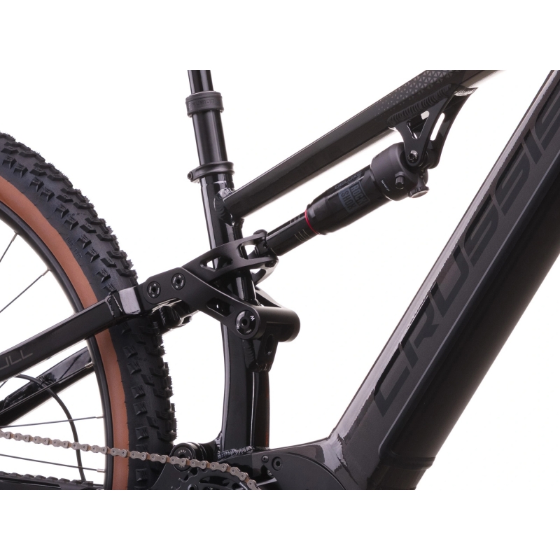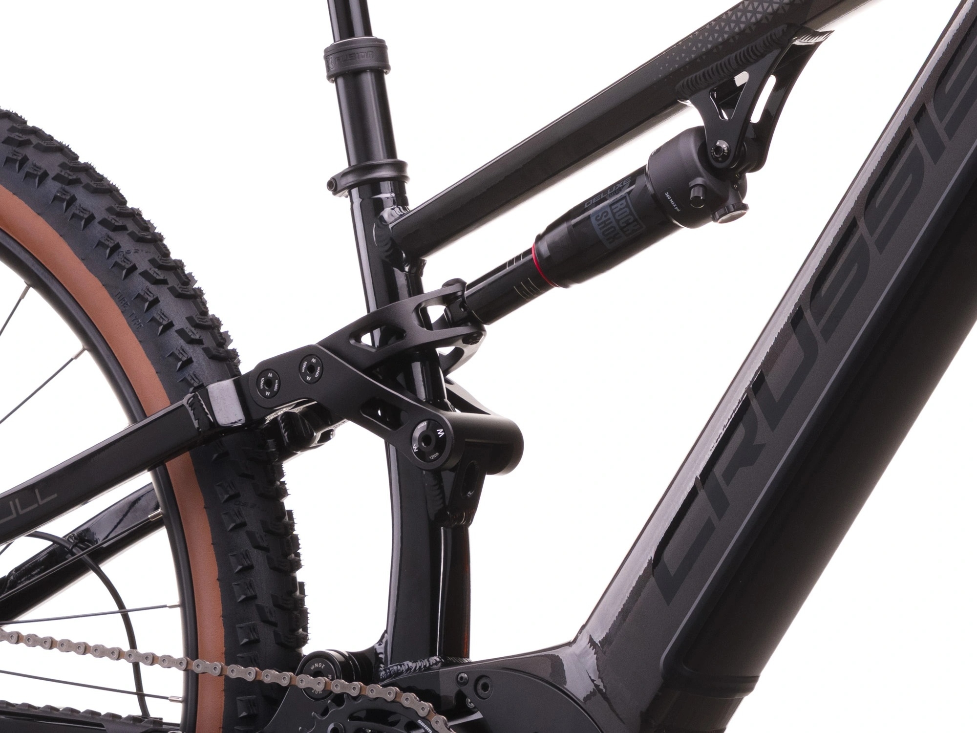 Rama z pełnym zawieszeniem w połączeniu z widelcem powietrzno-olejowym marki ROCKSHOX model FS Judy Silver TK Solo Air 29" BOOST (skok 130 mm) i tylnym powietrznym damperem ROCKSHOX DELUXE SELECT R zapewniają komfort nawet na kamienistych szlakach, korzeniach lub w trudnym terenie. E-rower trzyma się toru jazdy, amortyzuje wstrząsy i pozwala na precyzyjne prowadzenie bez zbędnej utraty energii.