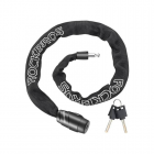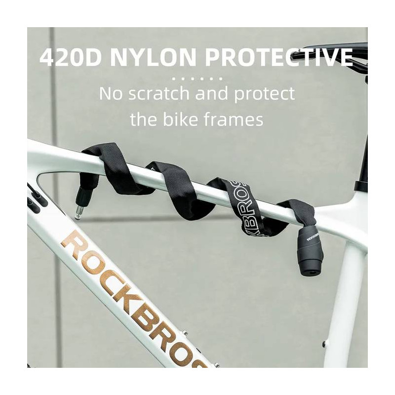 Zewnętrzny, miękki pokrowiec tekstylny chroni ramę roweru przed zarysowaniami, a elastyczna konstrukcja łańcucha pozwala na łatwe przypięcie nawet do trudniej dostępnych elementów.