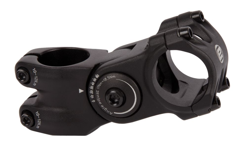 Stabilny mostek typu A z możliwością regulacji kąta, kuty 3D aluminium z 4-śrubowym zaciskiem kierownicy, regulowanym kątem i średnicą obejmy kierownicy 31,8 mm. Płyta czołowa możliwa do kupienia osobno.