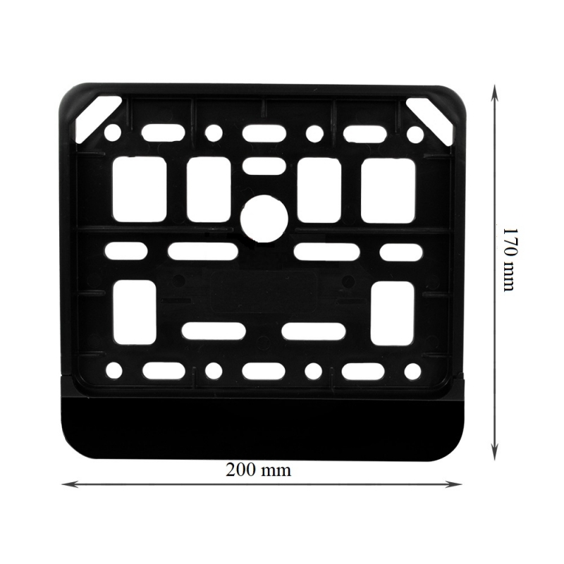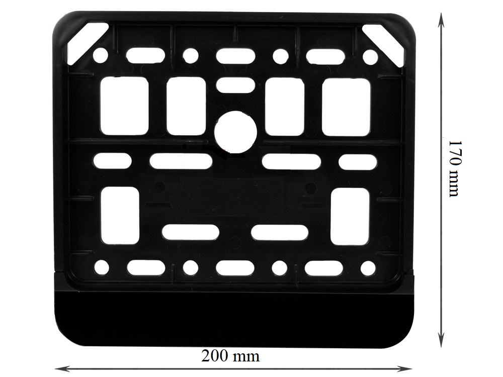 Ramka tablicy rejestracyjnej do motocykla. Kolor czarny, wymiary 170 na 200mm. Zamykana od dołu. Cena dotyczy jednej sztuki.