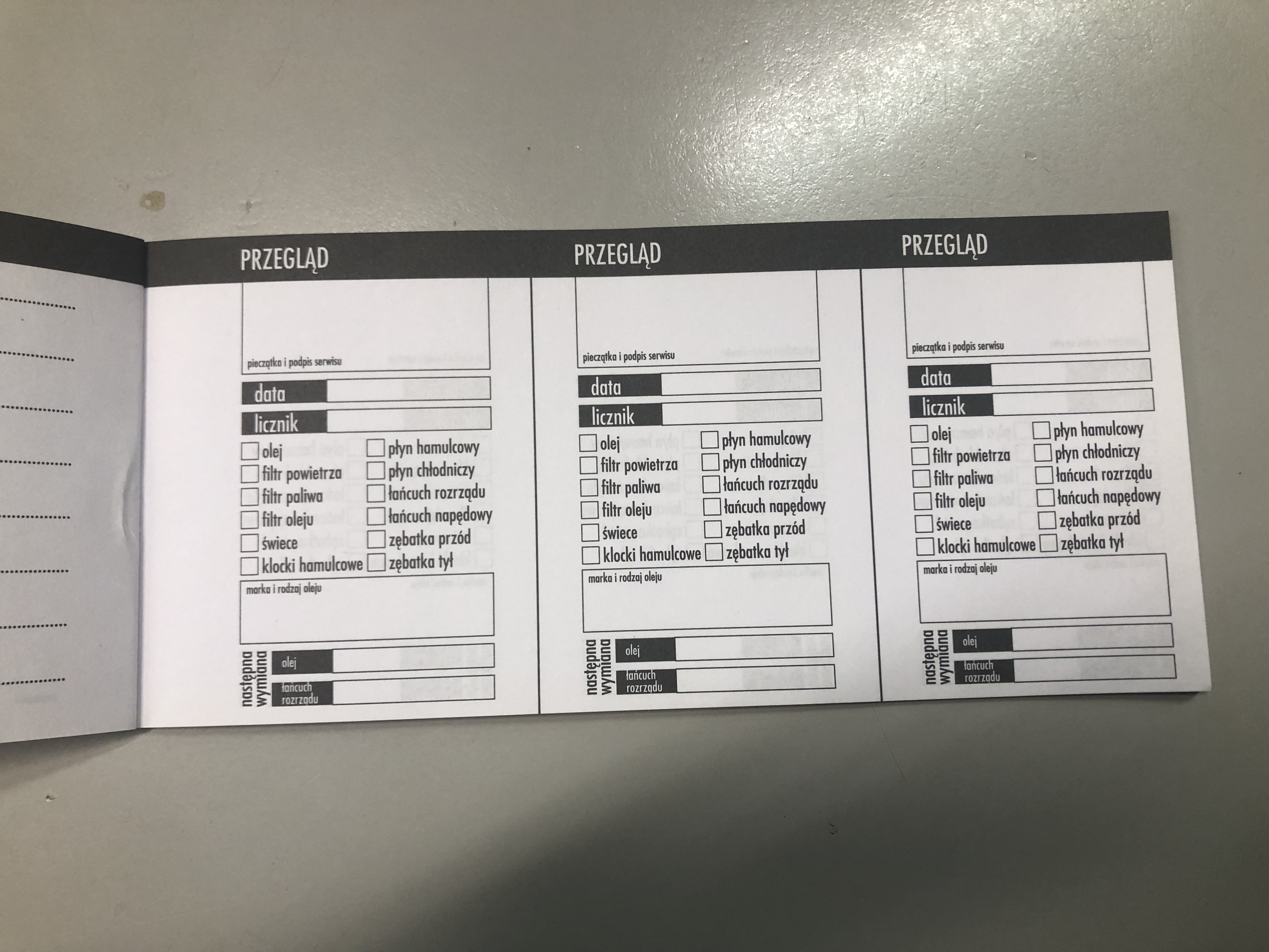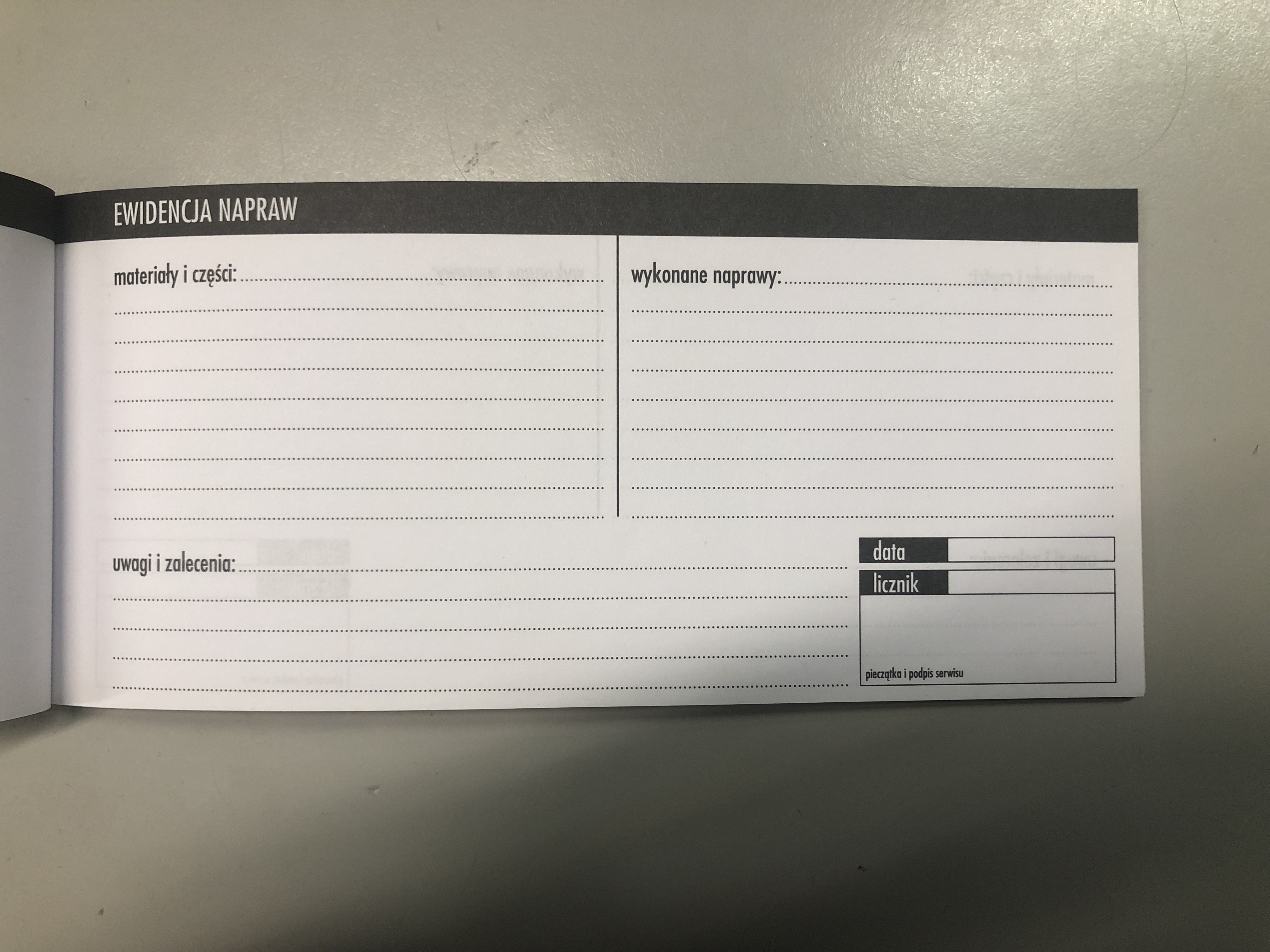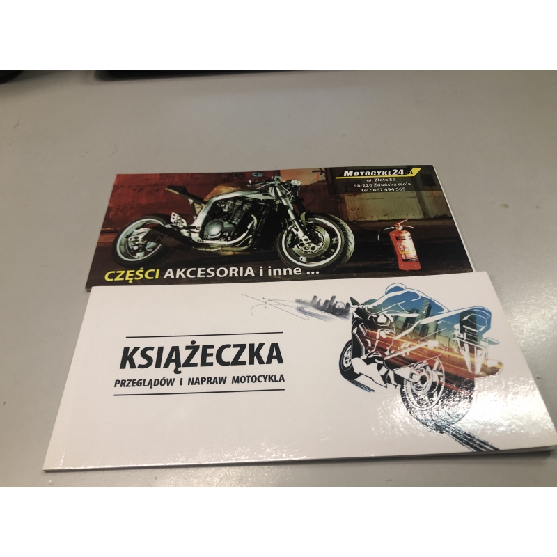 24 stronnicowa (z okładką 28 str.) książeczka przeglądów i napraw motocykla o wymiarze 21 x 9,5 cm (po rozłożeniu 42 x 9,5 cm). Książeczka serwisowa to świetny sposób na udokumentowanie serwisów, przeglądów, napraw, wymiany opon i części itd. Okładka książeczki drukowana jest w pełnym kolorze z miejscem na wpisanie danych warsztatu lub właściciela, środek w jednym kolorze (czarnym). Na Państwa życzenie możliwe jest nadrukowanie danych/loga na okładce oraz tyle książeczki lub pozostawienie pustego miejsca na ręczny wpis lub pieczątkę. Dzięki technologii druku cyfrowego książeczki są doskonałej jakości, a druk na nie ma prawa się rozmazywać nawet pod wpływem deszczu.
