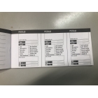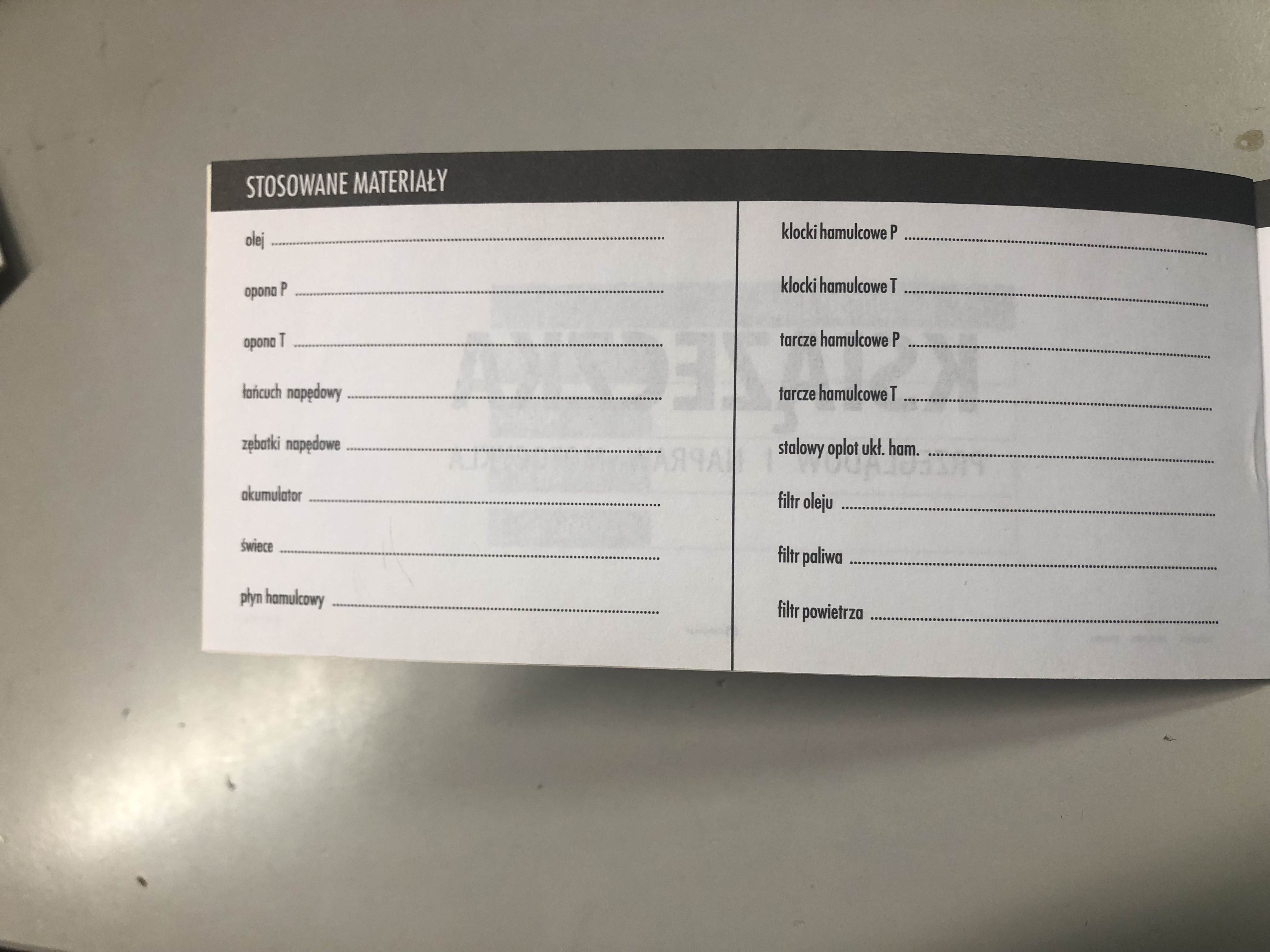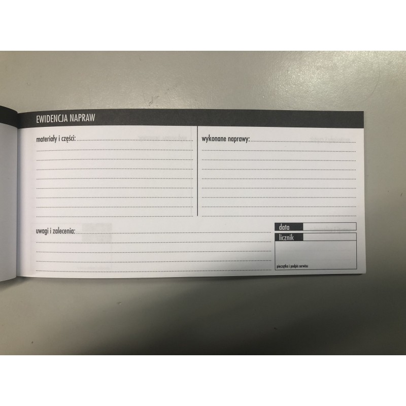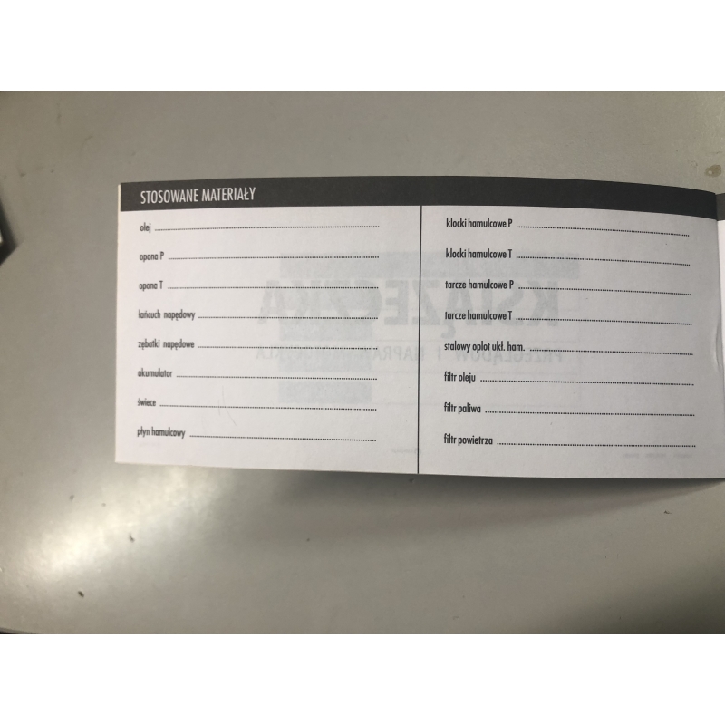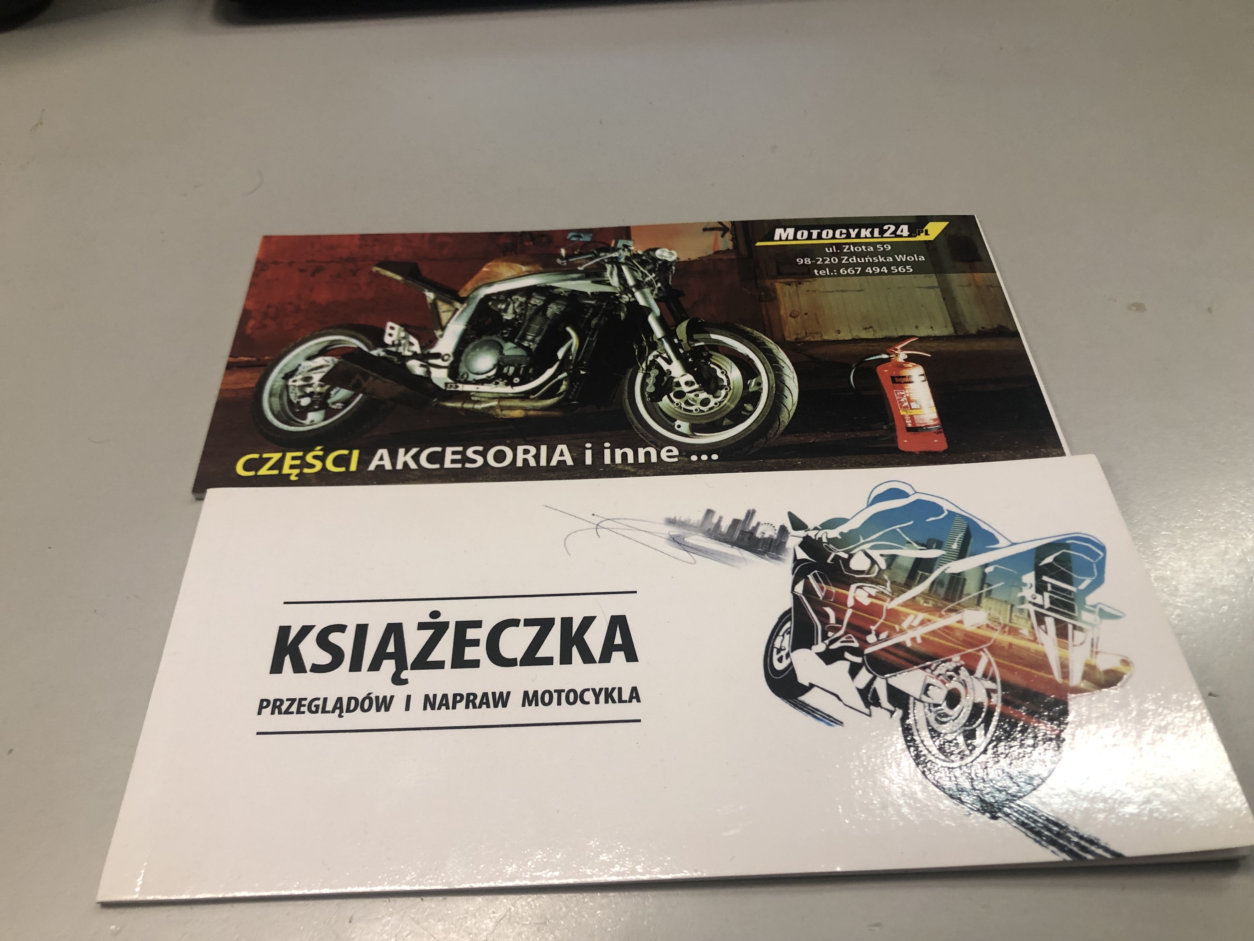 24 stronnicowa (z okładką 28 str.) książeczka przeglądów i napraw motocykla o wymiarze 21 x 9,5 cm (po rozłożeniu 42 x 9,5 cm). Książeczka serwisowa to świetny sposób na udokumentowanie serwisów, przeglądów, napraw, wymiany opon i części itd. Okładka książeczki drukowana jest w pełnym kolorze z miejscem na wpisanie danych warsztatu lub właściciela, środek w jednym kolorze (czarnym). Na Państwa życzenie możliwe jest nadrukowanie danych/loga na okładce oraz tyle książeczki lub pozostawienie pustego miejsca na ręczny wpis lub pieczątkę. Dzięki technologii druku cyfrowego książeczki są doskonałej jakości, a druk na nie ma prawa się rozmazywać nawet pod wpływem deszczu.