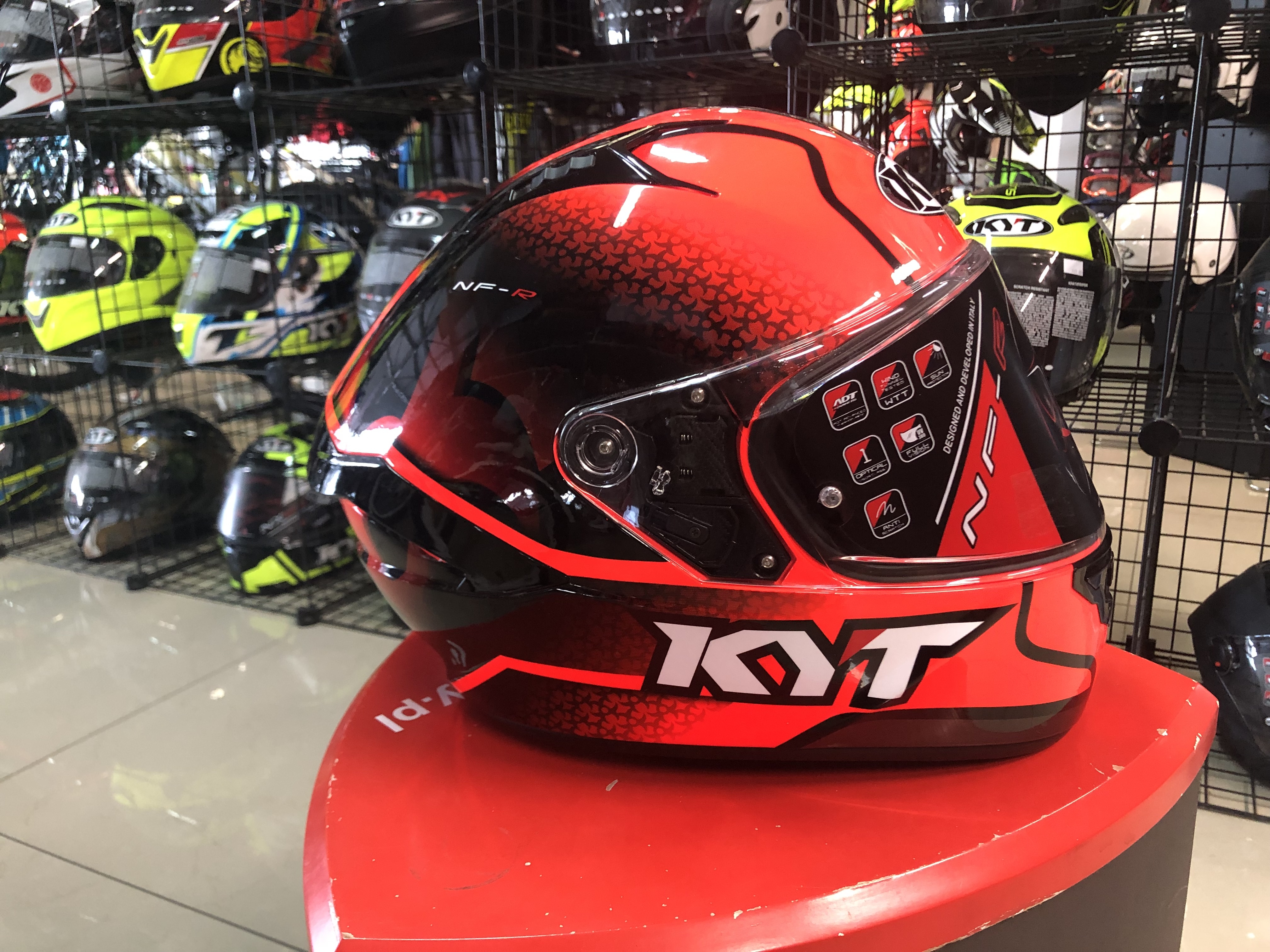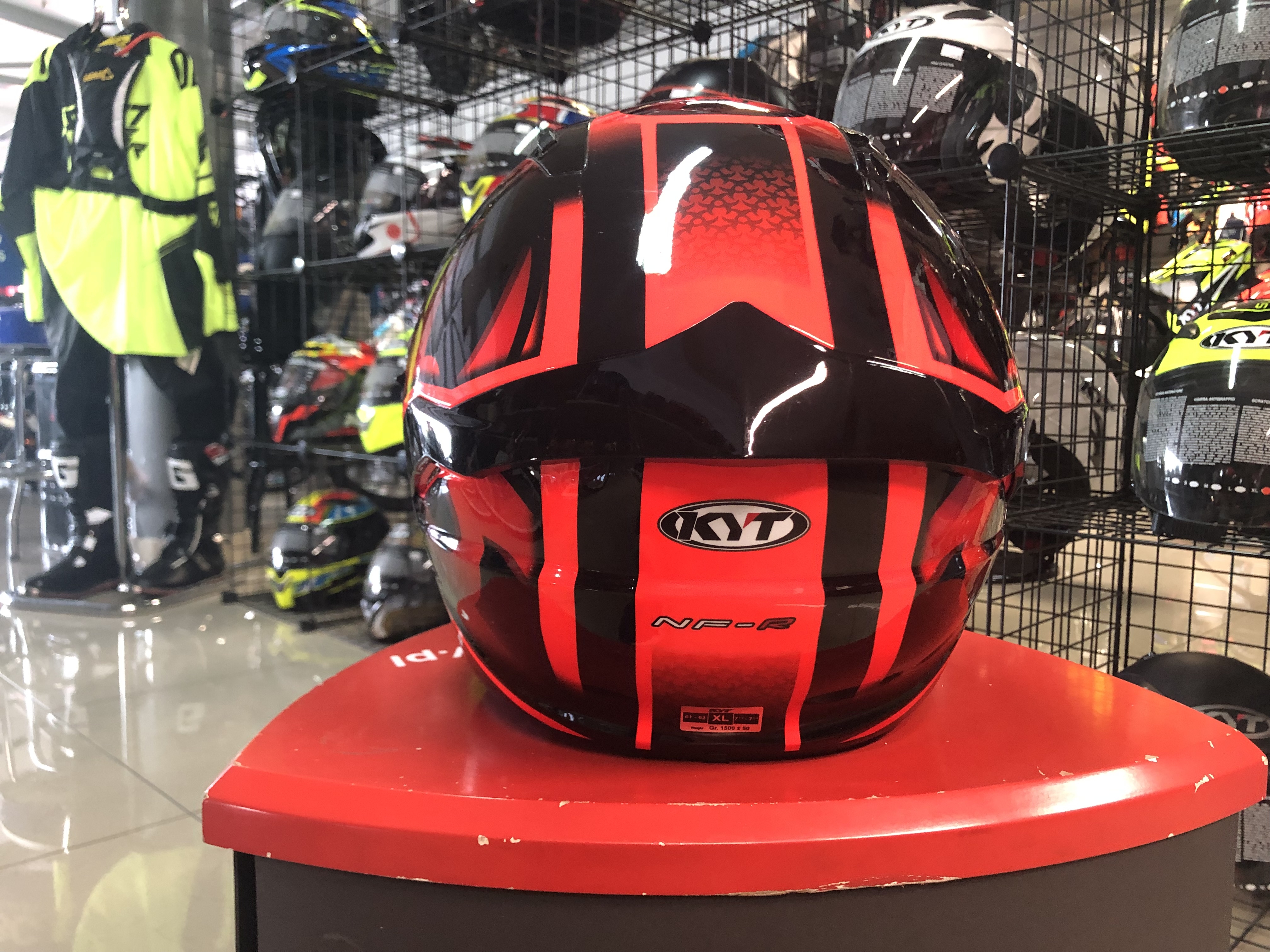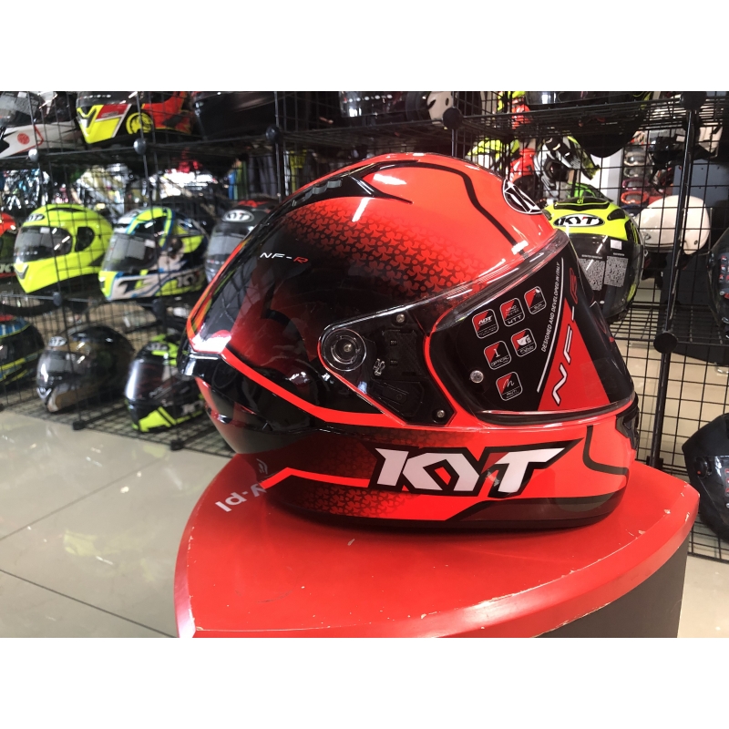 NF-R to kask integralny, elita marki KYT dla sektora turystyki sportowej. Dział badań i rozwoju rozpoczął ambitną podróż, aby zrównoważyć cechy kasku wyścigowego z niezbędnymi potrzebami turystycznymi i miejskimi. Skuteczna wentylacja, aerodynamiczny spojler i ograniczniki obciążeń pasują do wygodnego i naturalnego dopasowania. Dodatkowo mikrometryczny system zapięcia i skorupa w dwóch rozmiarach wykonana jest z „ADV”. Co więcej, NF-R jest wyposażony w wizjer klasy optycznej „1” w połączeniu z „Pinlock Max Vision” i osłoną przeciwsłoneczną.
