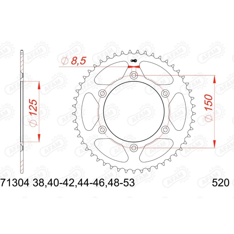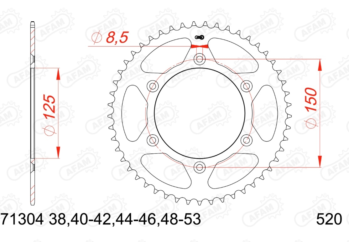 Nowa, oryginalna zębatka motocyklowa marki AFAM. Kolor srebrny, materiał stal, pasuje do łańcucha 520. Współpracuje z szeroką gamą maszyn z listy poniżej: