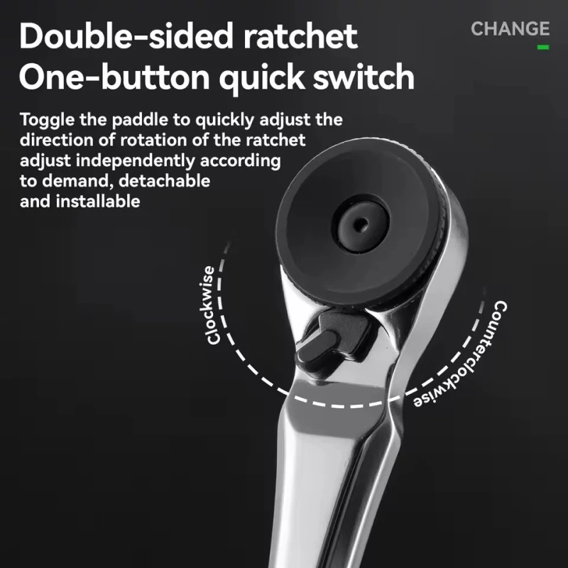 Precyzyjna grzechotka dwukierunkowa: Sercem zestawu jest wysokiej klasy klucz grzechotkowy. Dzięki przełącznikowi kierunku obrotów (One-button quick switch), widocznemu na zdjęciach, możesz błyskawicznie zmieniać tryb z dokręcania na odkręcanie bez konieczności zdejmowania narzędzia ze śruby. To ogromne ułatwienie w trudno dostępnych miejscach.