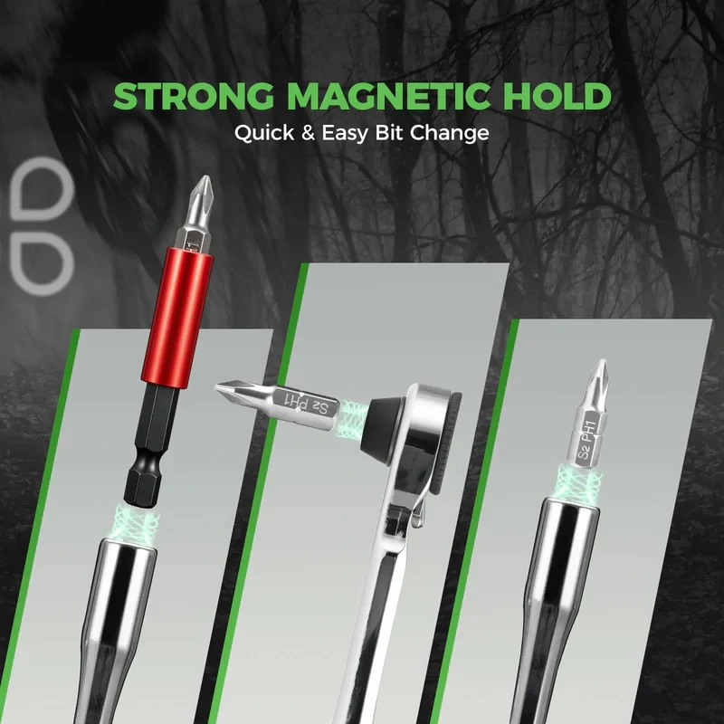 Magnetyczny system mocowania: Koniec z wypadającymi bitami! Uchwyt wyposażono w silny magnes, który stabilnie trzyma końcówki na miejscu (jak pokazano na grafikach). Wymiana bitów jest szybka, płynna i bezproblemowa, a Ty nie musisz martwić się o zgubienie drobnych elementów w trawie czy na asfalcie.