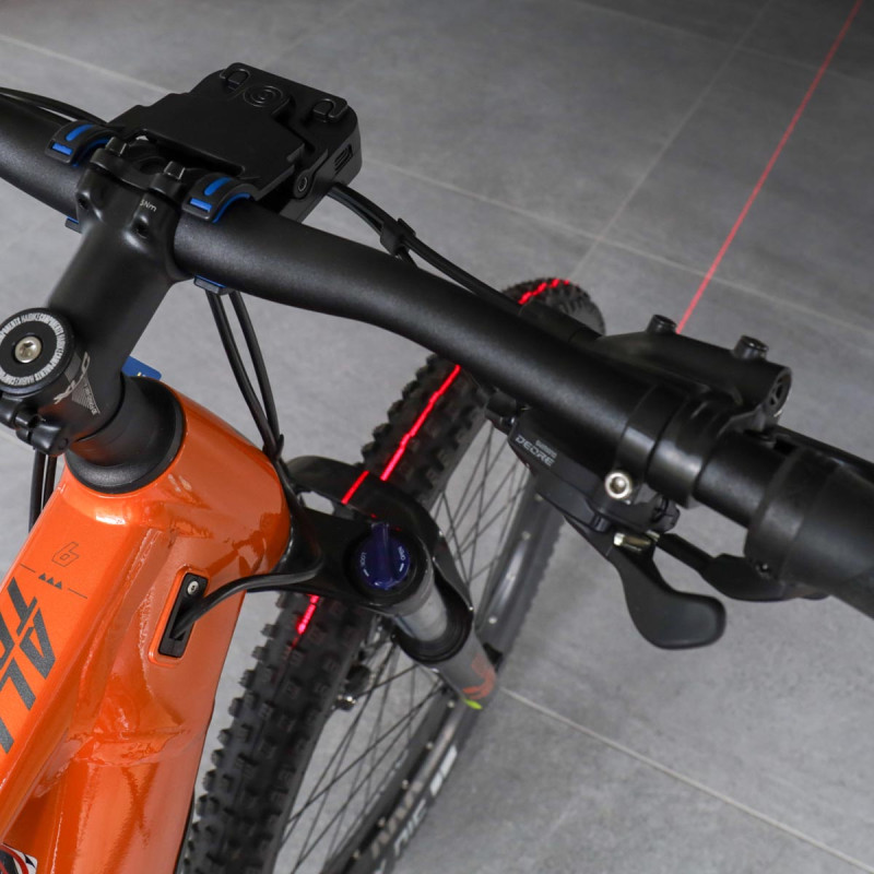 Precyzja ustawienia: kalibrator montuje się bezpośrednio na wsporniku lub kierownicy. Wiązka światła pozwala błyskawicznie sprawdzić, czy linia środkowa pokrywa się ze środkiem opony, co gwarantuje idealne ustawienie osi roweru.
