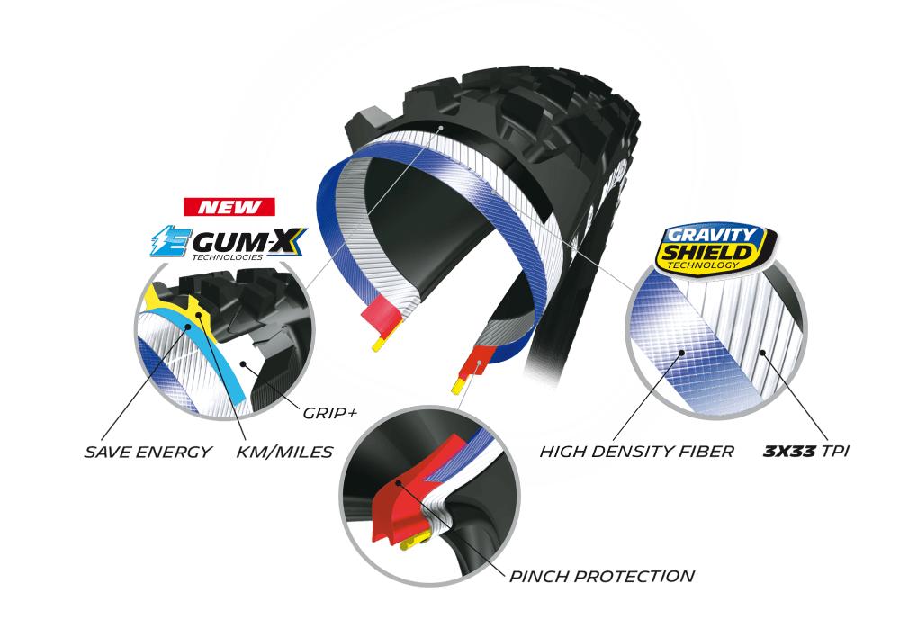 - nowa mieszanka gumowa E-GUM-X i wzór bieżnika z serii Enduro zapewniają dodatkową przyczepność