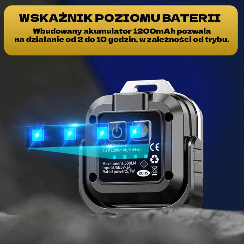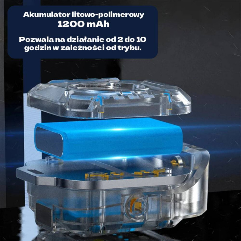 - Długa praca na baterii – wbudowany akumulator 1200mAh pozwala na działanie od 2 do 10 godzin w zależności od trybu.