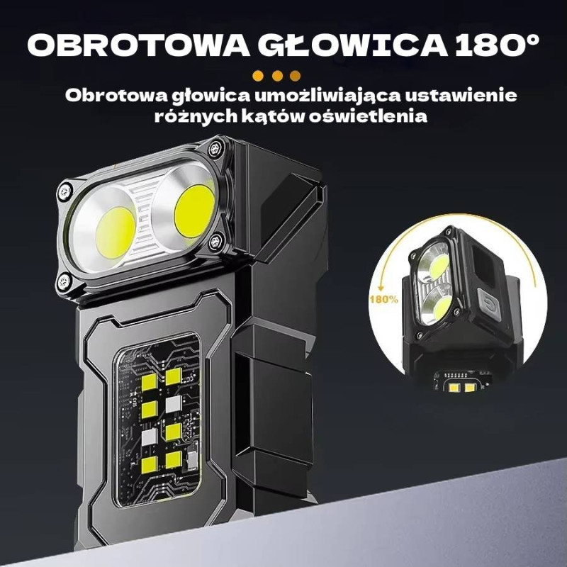 - Dodatkowe cechy: Obrotowa głowica 180 stopni, Wyświetlacz LCD do sprawdzania stanu baterii, magnes z dołu lampki, klips