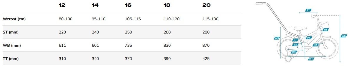 ROCKET CS to model występujący w rozmiarze kół: 12/14/16/18/20”, stąd możliwość doboru właściwego rowerka dla dzieci w wieku 2-8 lat.
