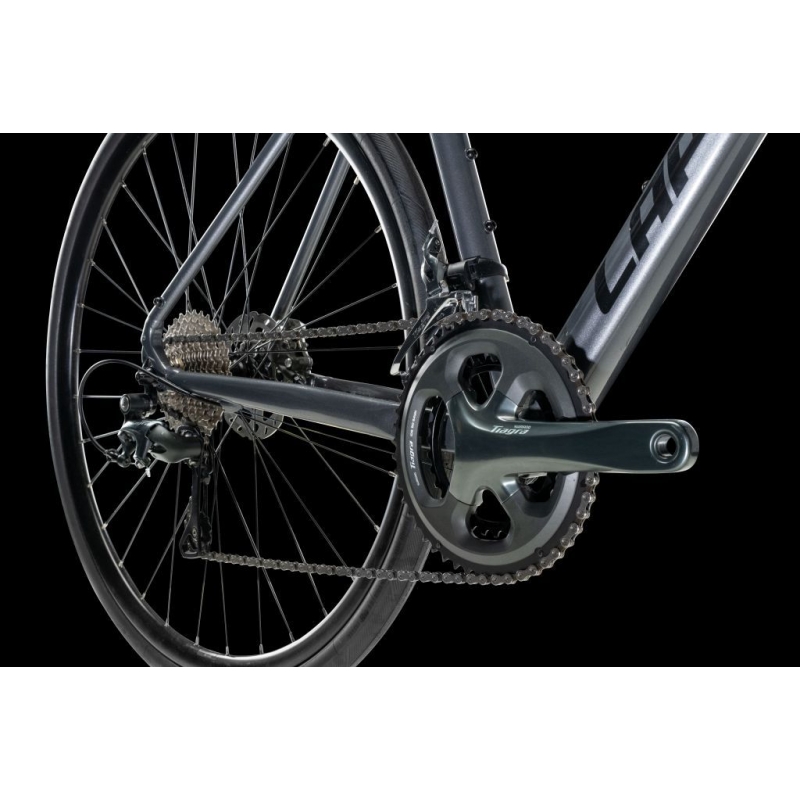 Napęd oparty na sprawdzonej grupie Shimano Tiagra 2x10 pozwala na płynne i niezawodne zmiany przełożeń w zróżnicowanym terenie – od płaskich odcinków po strome podjazdy. Z kolei wydajne hamulce tarczowe dają pewność i precyzję hamowania niezależnie od pogody czy warunków na drodze.