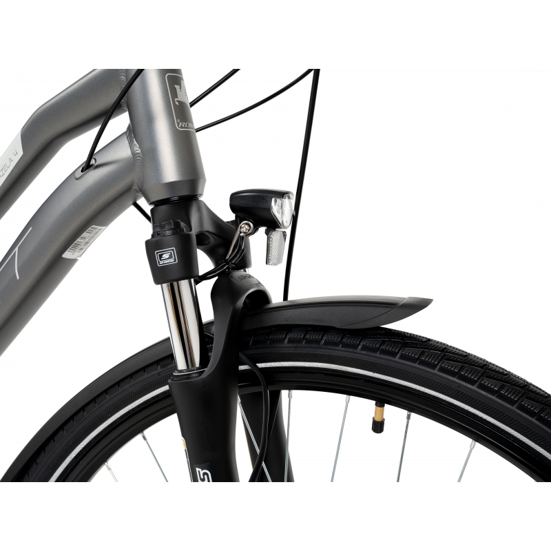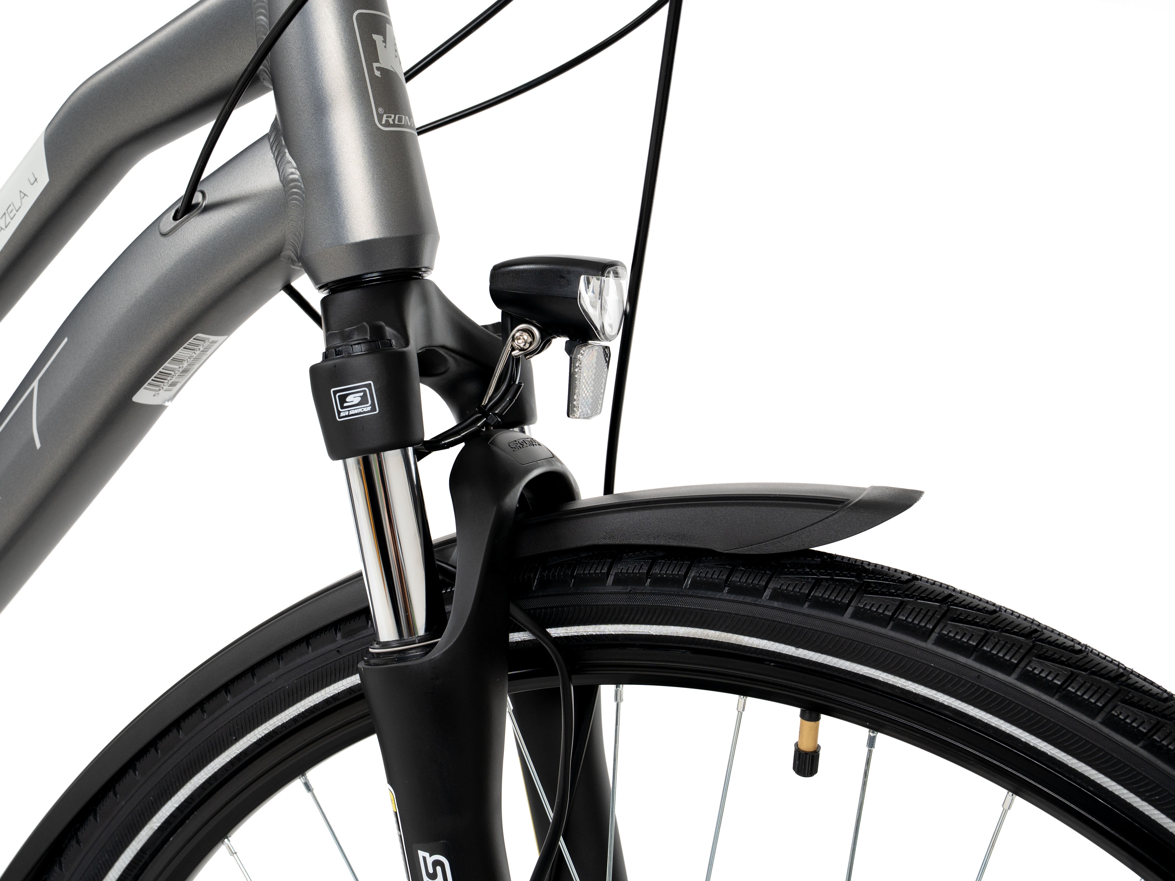 Za tłumienie nierówności odpowiada amortyzowany widelec SR Suntour SF-14 NEX-DS 700C, który poprawia komfort jazdy na gorszej nawierzchni, kostce brukowej, ścieżkach szutrowych czy drogach o nierównym podłożu. Dzięki temu Romet Gazela 4 dobrze radzi sobie nie tylko w mieście, ale również podczas rekreacyjnych wycieczek poza utwardzone drogi.
