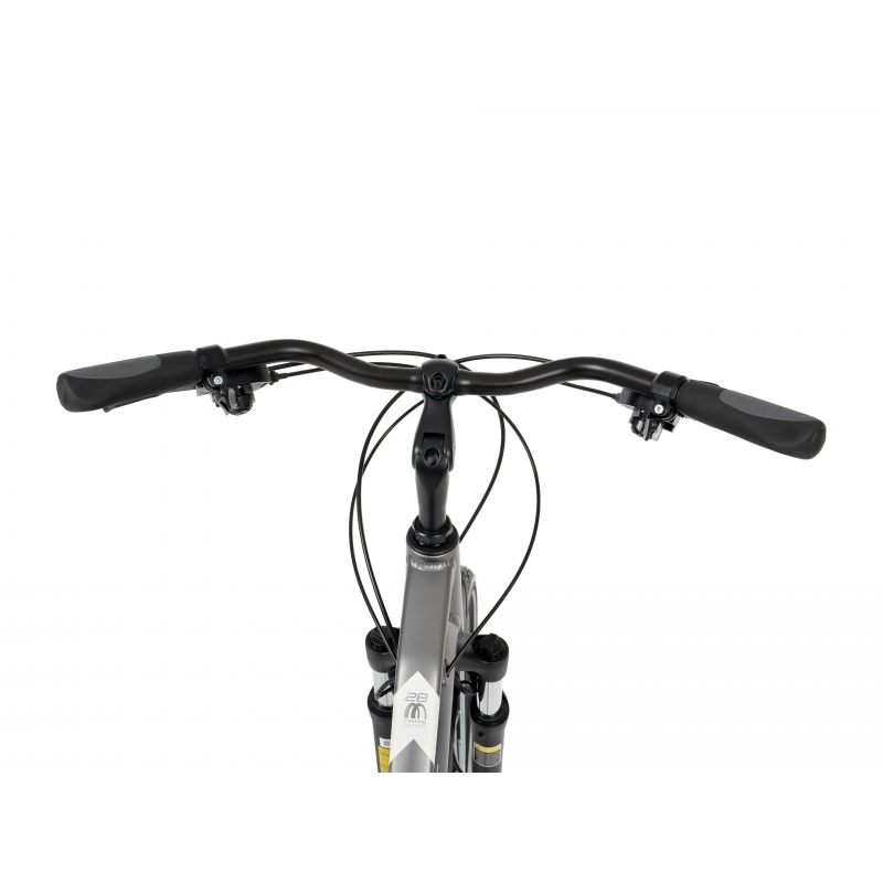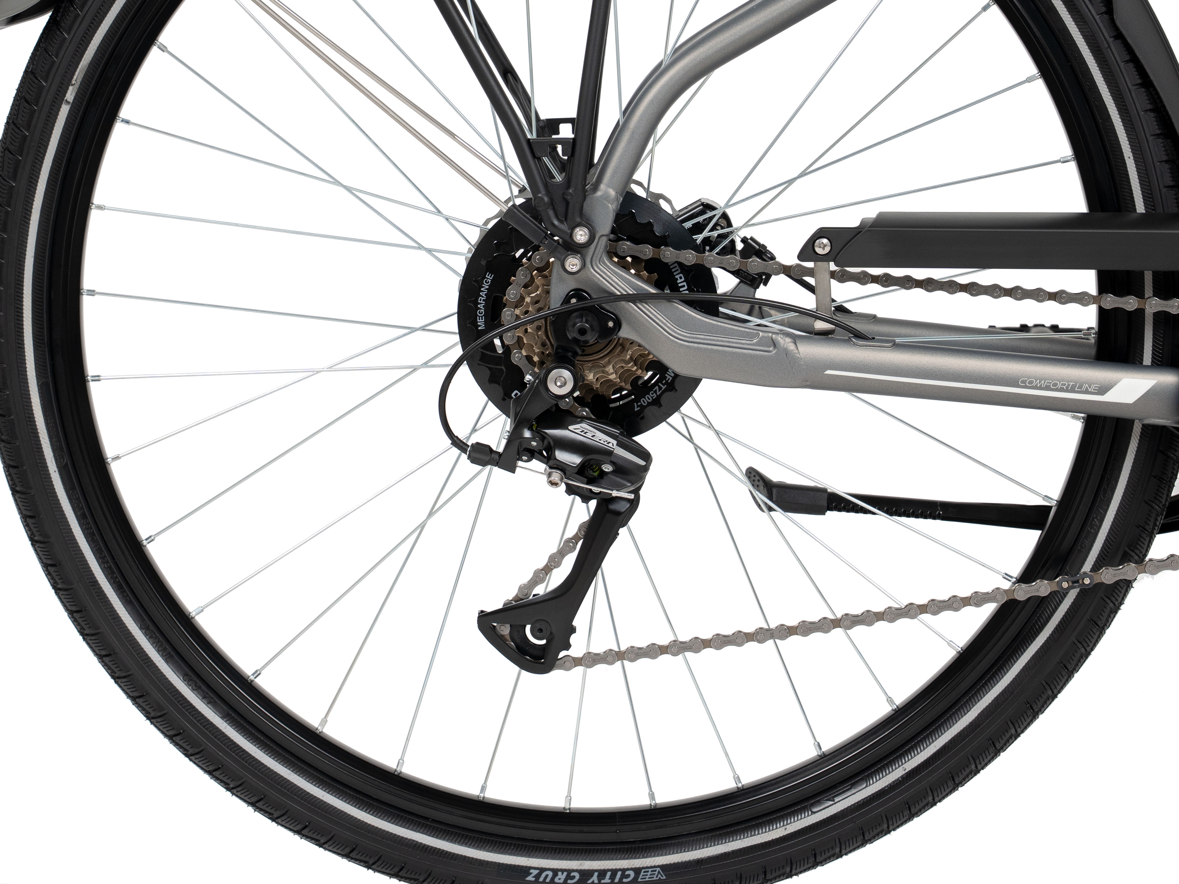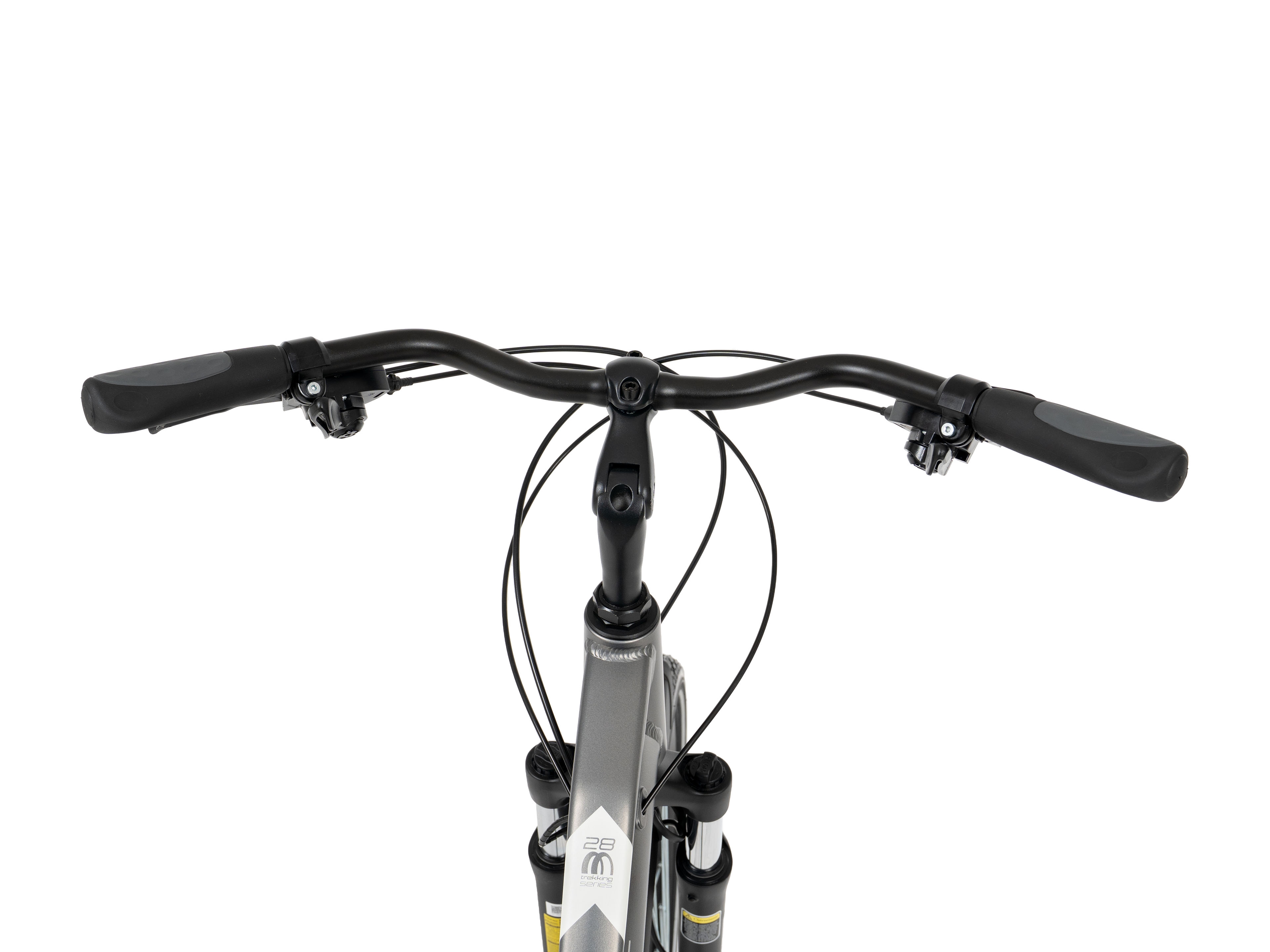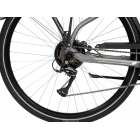 Rower porusza się na dużych kołach 28 cali, które dobrze utrzymują płynność jazdy i sprawdzają się podczas pokonywania dłuższych dystansów. Opony VEE TIRE CITY TOUR 28 x 1.7 / 700 x 42C oferują dobrą równowagę pomiędzy komfortem, przyczepnością i uniwersalnością użytkowania, dzięki czemu rower dobrze radzi sobie na asfalcie oraz drogach o nieco luźniejszej nawierzchni.