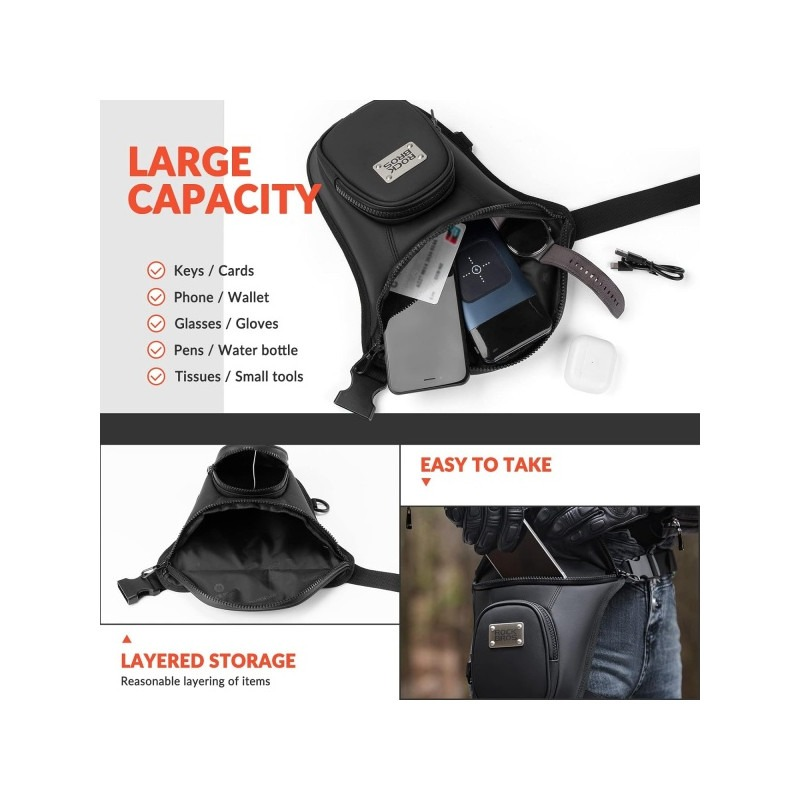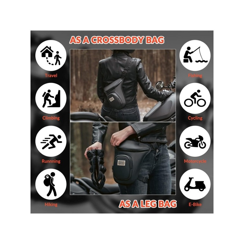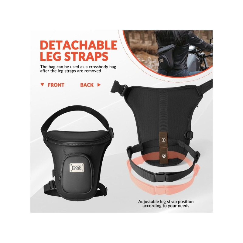 Torba motocyklowa Rockbros może być używana na dwa sposoby: jako torba na biodro/udo lub torba na ramię. Dzięki regulowanym pasom można łatwo dopasować ją do indywidualnych potrzeb.