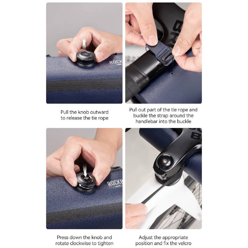 Torba posiada szybki i prosty montaż na kierownicy, co pozwala na błyskawiczne przymocowanie lub zdjęcie jej z roweru. Jej cylindryczny kształt i zwijane zamknięcie dodatkowo zabezpieczają zawartość.