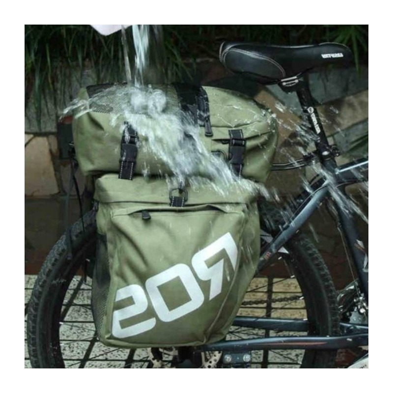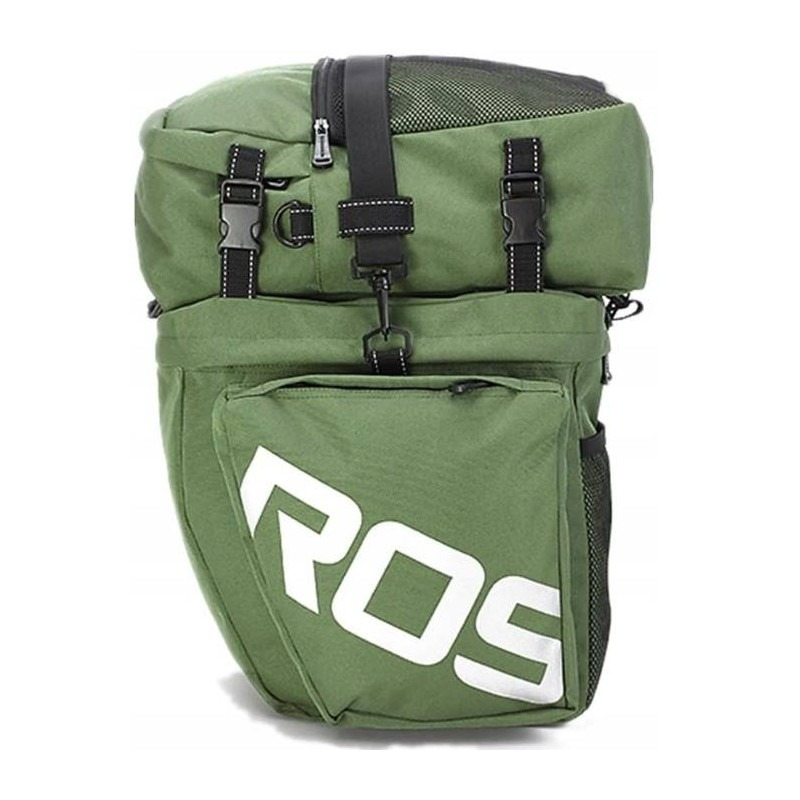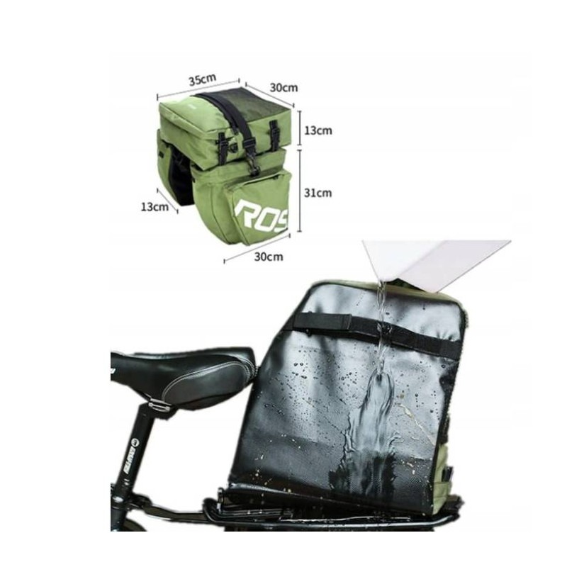 Budowa: trzy częsciowy zestaw sakw rowerowych; sakwy boczne z dwoma komorami - obie zamykane na zamek; sakwa górna z komorą główną + siateczką zamykaną na zamek