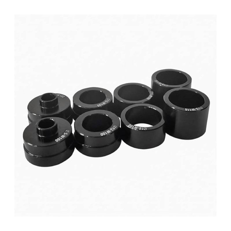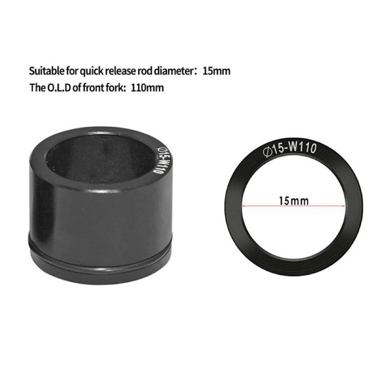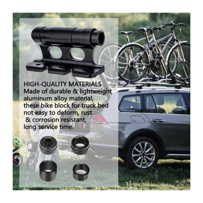 Uchwyt jest wyposażony w cztery pary adapterów osi przelotowej (10x100mm, 12x100mm, 15x100mm, 15x110mm) oraz adaptery szybkiego zwalniania. Każdy adapter jest wyraźnie oznaczony, co ułatwia rozpoznanie i używanie, sprawiając, że bagażnik jest odpowiedni dla większości rowerów z szybkim zwalnianiem i osiami widelca.