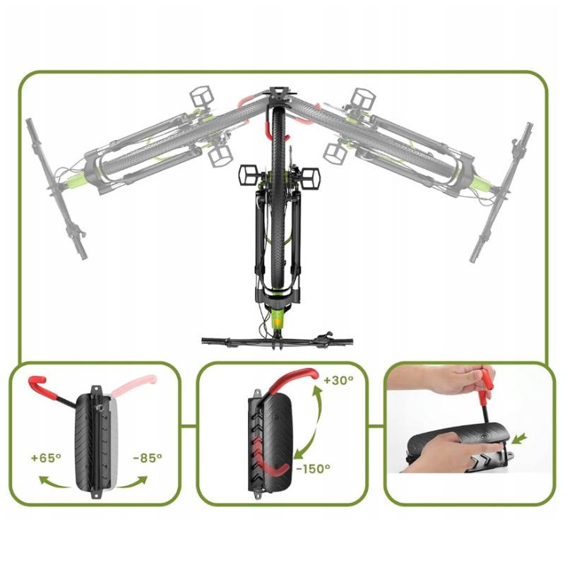 Dzięki obrotowej głowicy regulowanej w zakresie 150°, możesz dostosować pozycję roweru względem ściany – nawet w ciasnych pomieszczeniach. Uchwyt pozwala zaoszczędzić miejsce na podłodze, jednocześnie gwarantując bezpieczeństwo zawieszenia.