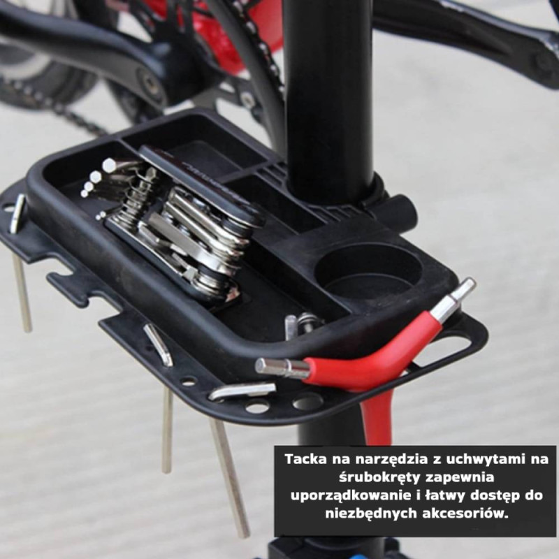 - Stojak udźwignie do 30 kg obciążenia, co czyni go kompatybilnym z różnymi modelami rowerów.