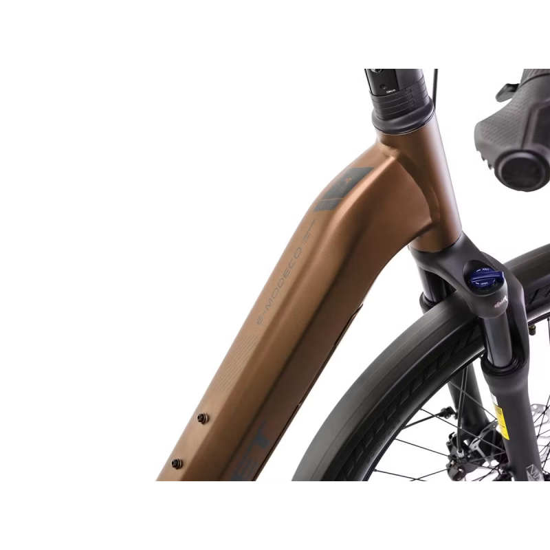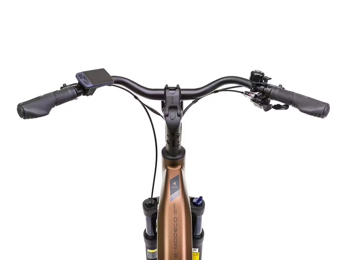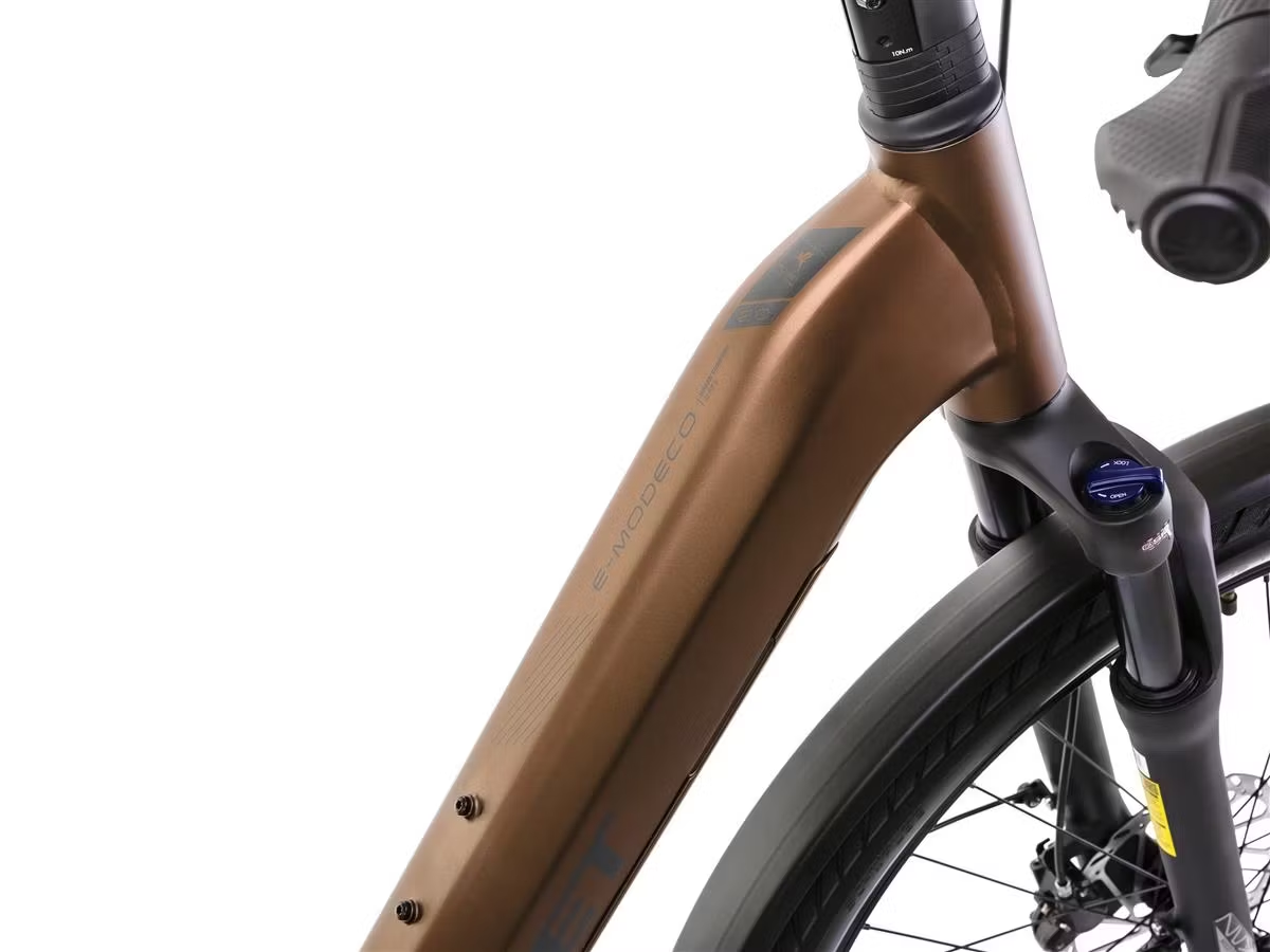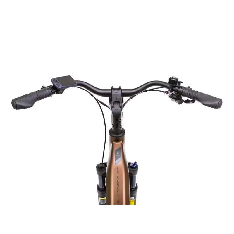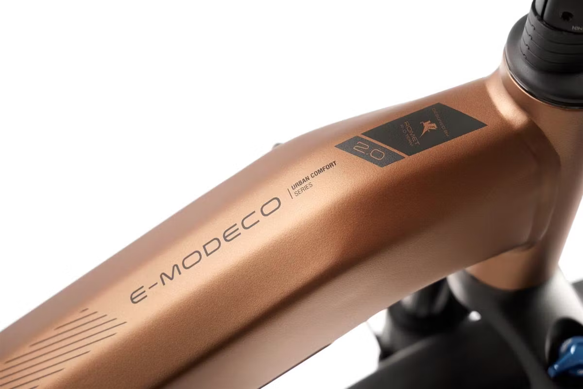 Romet E-MODECO 2.0 540 – to miejski rower elektryczny o nowoczesnym wzornictwie, zapewniający wysoki poziom komfortu. Solidna i zbudowana według najnowszych trendów rama, oferowana jest w trzech wersjach kolorystycznych: brązowo-czarnej, szampańsko-czarnej oraz czarno-grafitowej. Dzięki temu każdy może dobrać malowanie do swoich potrzeb, a E-MODECO 2.0 sprawdza się jako męski i damski elektryczny rower miejski. Sprawne pokonywanie miejskich przestrzeni umożliwia silnik o mocy 250 Watt i momencie obrotowym 65 Nm. Bateria o pojemności 540 Wh zapewni osiąganie dużych zasięgów. E-MODECO został zaprojektowany w ten sposób, aby nie tylko wspomagać nabieranie prędkości i wspieranie rowerzysty na trasie, ale także aby zapewnić mu jak najwięcej komfortu. Wygodne, obszerne siodło, przedni amortyzator o skoku 80 milimetrów sprawiają, że większość przeszkód na drodze jest praktycznie nieodczuwalna dla kierującego. Spora w tym zasługa również dużych kół o średnicy 28 cali. Nie tylko świetnie wybierają nierówności, ale też pozwalają na osiąganie wyższych prędkości. Tylna przerzutka o 9 przełożeniach jest niezastąpiona przy pokonywaniu wzniesień i podjazdów, a opony zostały dobrane specjalnie pod kątem przemierzania asfaltowych ścieżek – również podczas deszczu. Romet E-MODECO 2.0 540 – miejski, praktyczny i uniwersalny rower elektryczny.